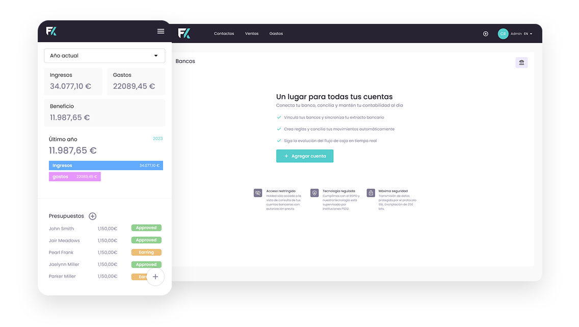 Registre precís de despeses categoritzades, genera informes. integració amb comptes bancaris.